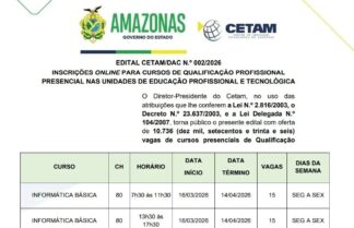 Cetam abre mais de 10 mil vagas em cursos de qualificação para o interior do Amazonas Empregos Manaus / 12 de fevereiro de 2026