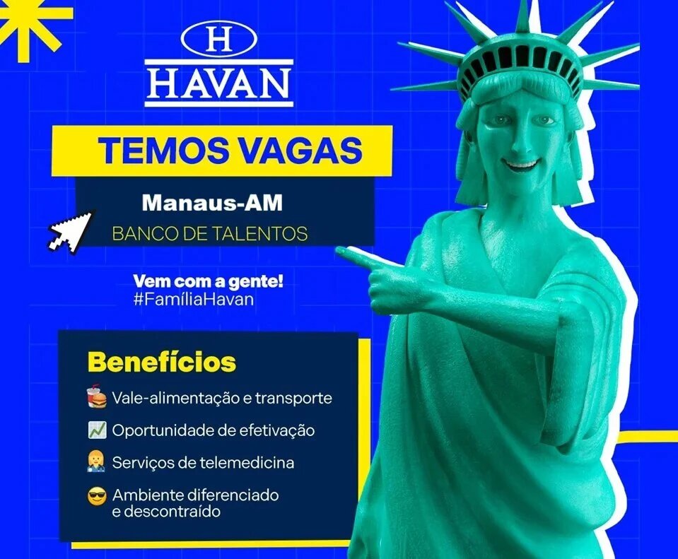 A Havan, uma das maiores redes de lojas de departamentos do Brasil, anunciou a abertura de diversas oportunidades de emprego para o mês de março em sua unidade de Manaus, localizada na Avenida das Torres. A empresa busca novos talentos para integrar sua equipe, oferecendo um ambiente dinâmico e chances de crescimento profissional.