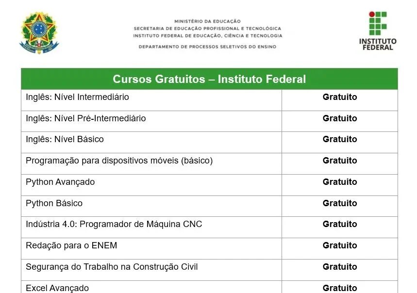 O Instituto Federal de Minas Gerais (IFMG) lançou um edital com mais de 6 mil vagas em cursos gratuitos, disponibilizados através da plataforma de educação a distância Mais IFMG. As oportunidades abrangem áreas como tecnologia, inovação, artes, gestão e ciências, com o objetivo de promover a qualificação profissional e a atualização para o mercado de trabalho.